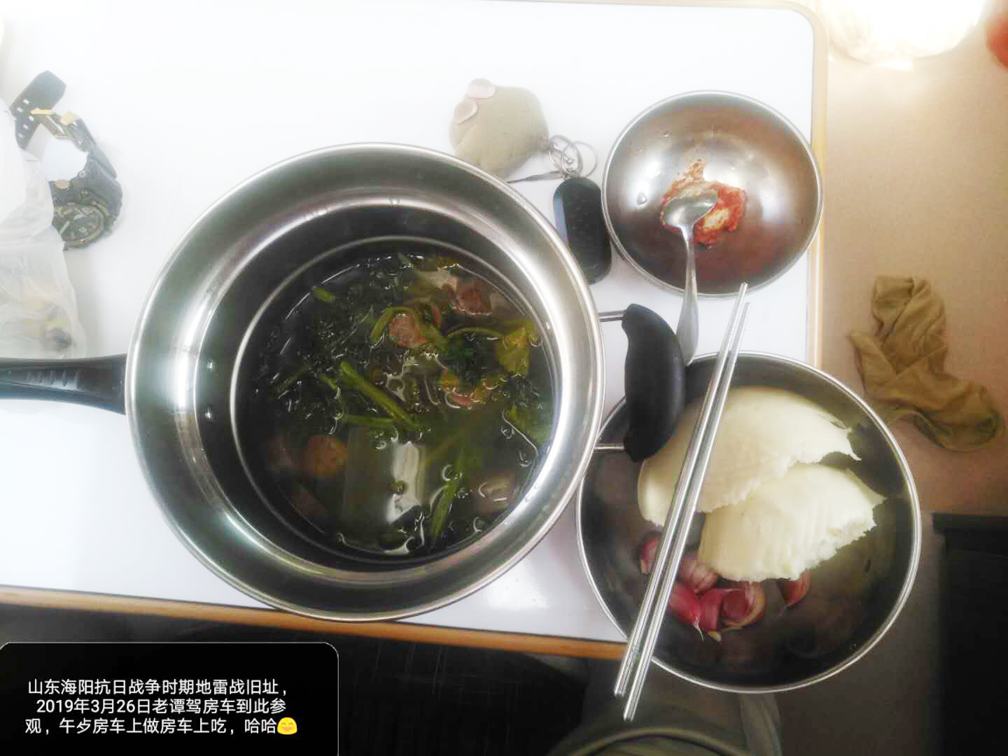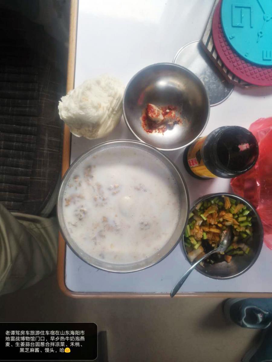 將進口依維柯底盤房車停在地雷戰(zhàn)博物館門口,老伴兒在車上自帶的廚房準備早餐,熟牛奶泡燕麥、生姜蒜薹圓蔥拌涼菜、禾桃、黑芝麻醬、饅頭……不多時,家常飯菜就端上了桌,干凈衛(wèi)生不說,隨時隨地都有家的歸屬感!