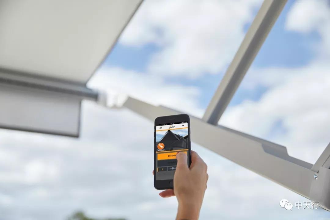 用藍牙將遮陽棚和手機連接,在藍牙范圍內通過手機APP即可控制電動遮陽篷的打開或者關閉。
