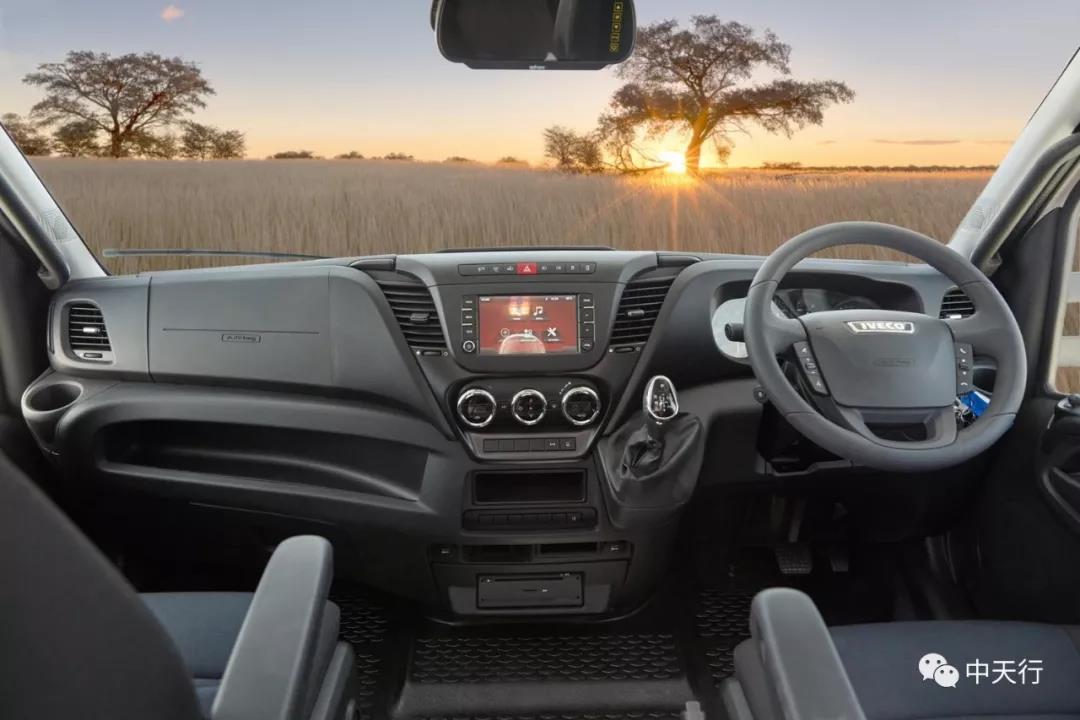 駕駛室保留了進口依維柯New Daily原有的風格,右置多功能方向盤,檔把也在右側,需要左手換擋,可能國內的司機看著會不習慣。此外,中控顯示屏集成了導航、音樂、語音功能;差速鎖的標志清晰可見,這也是進口依維柯底盤的一大特色。