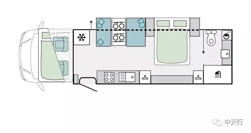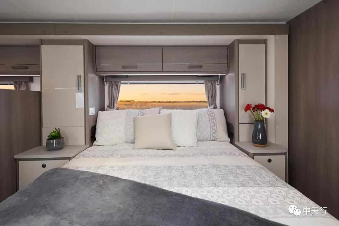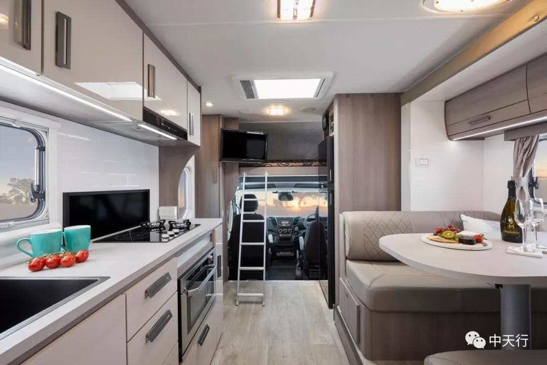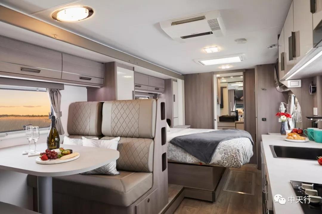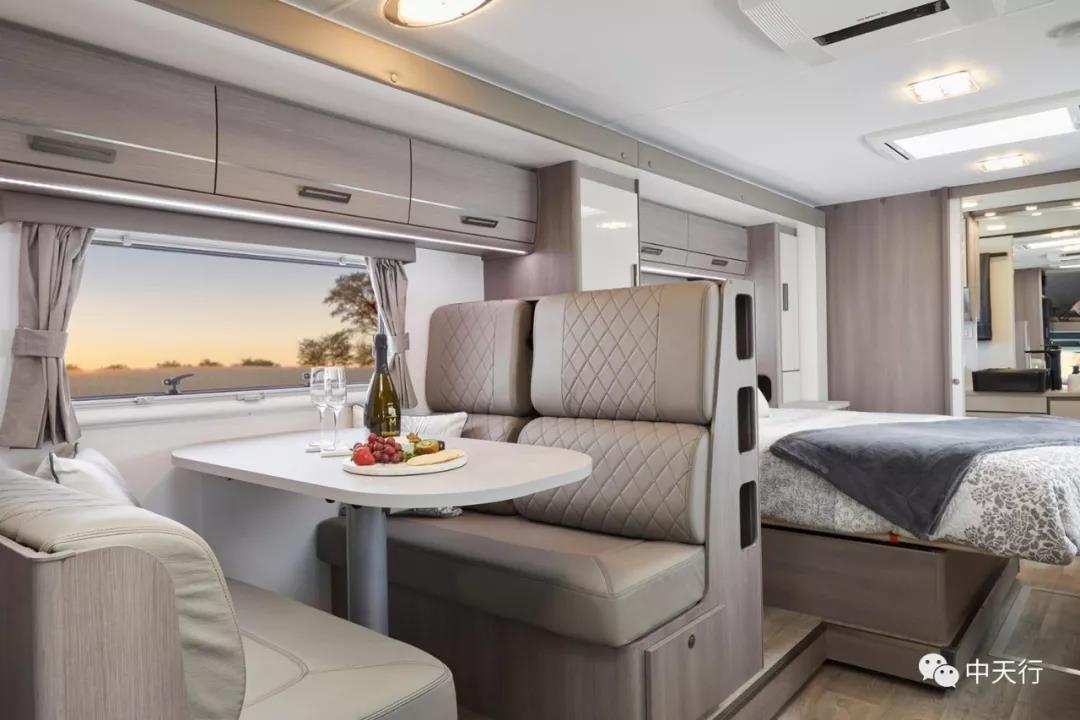 房車設計者從澳大利亞的風景中獲得了內飾設計的靈感,中性的設計風格,給人以豪華舒適的感覺。從布局圖可以看出,該車從前到后依次是頂置雙人床、216L車載冰箱、雙人對坐沙發(fā)卡座、一體式廚房、雙人床、尾置衛(wèi)生間,空間寬敞。