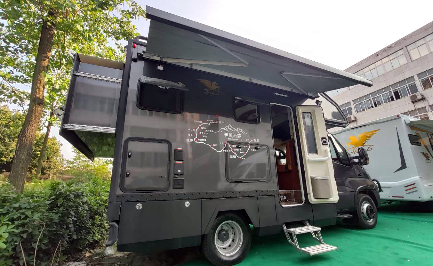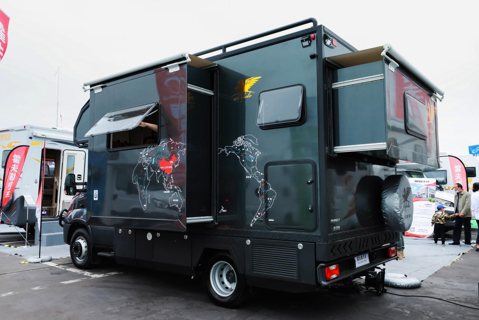 外形尺寸為5990×2364×3220mm,可上藍牌,C本駕駛。車身黑色涂裝,小額頭造型采用多邊形棱角勾勒,前保險杠、防撞雷達、4個LED射燈等配置,增加了氣勢。后拓展設(shè)計,車身右側(cè)配置了遮陽棚、戶外雙向抽拉廚柜 + 戶外燃氣灶臺 、戶外電源、戶外插座、電動踏步、貫通式儲物倉等,滿足戶外生活需要。