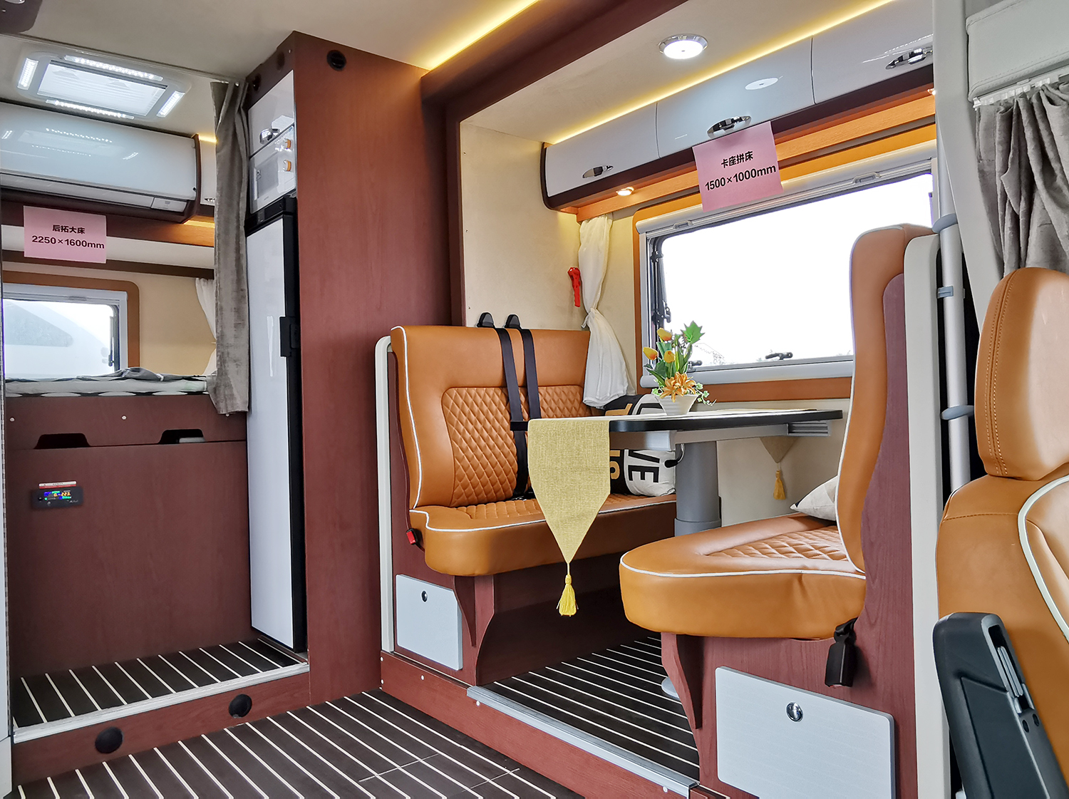 車廂尾部是2250×1600mm的雙人床,雙人床上方配有儲物柜,可以放日常用品,還設(shè)置了一臺1.5P家用變頻冷暖空調(diào)。