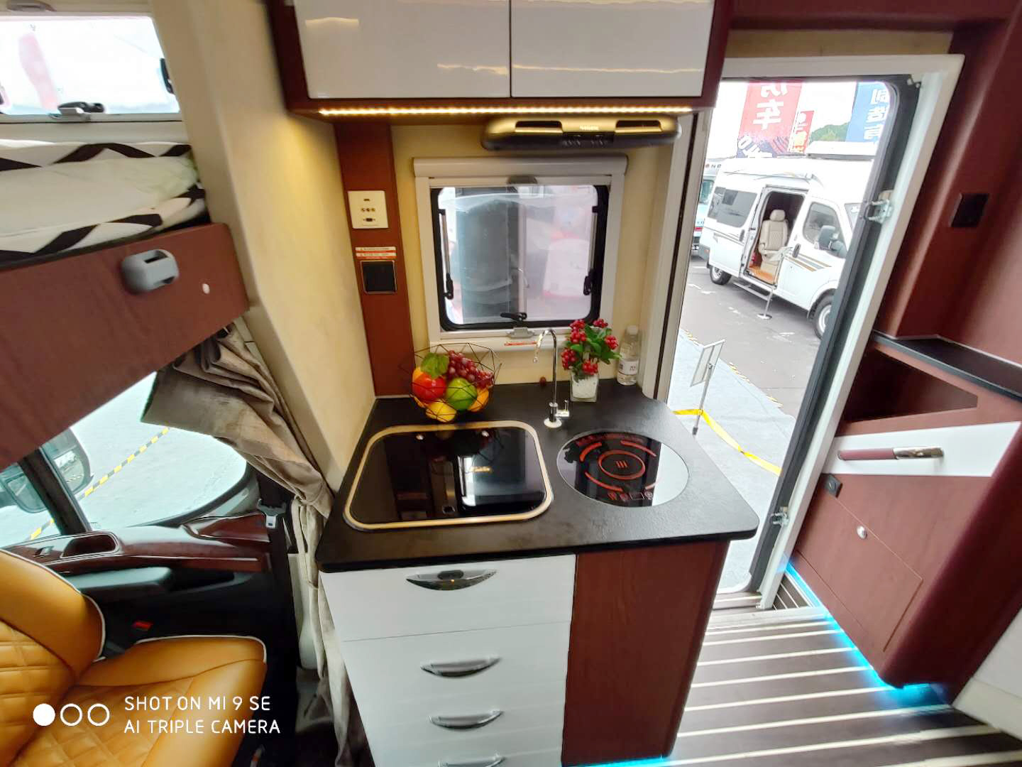 廚房位于副駕駛后邊,儲物柜、抽油煙機、帶蓋洗菜池、電磁爐等配置齊全,下方櫥柜側(cè)面還設(shè)置了3公斤洗衣機,帶烘干功能,使用方便。