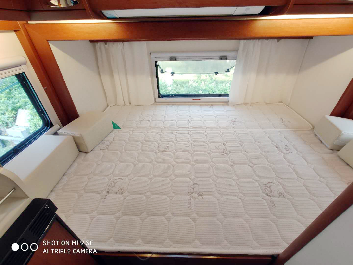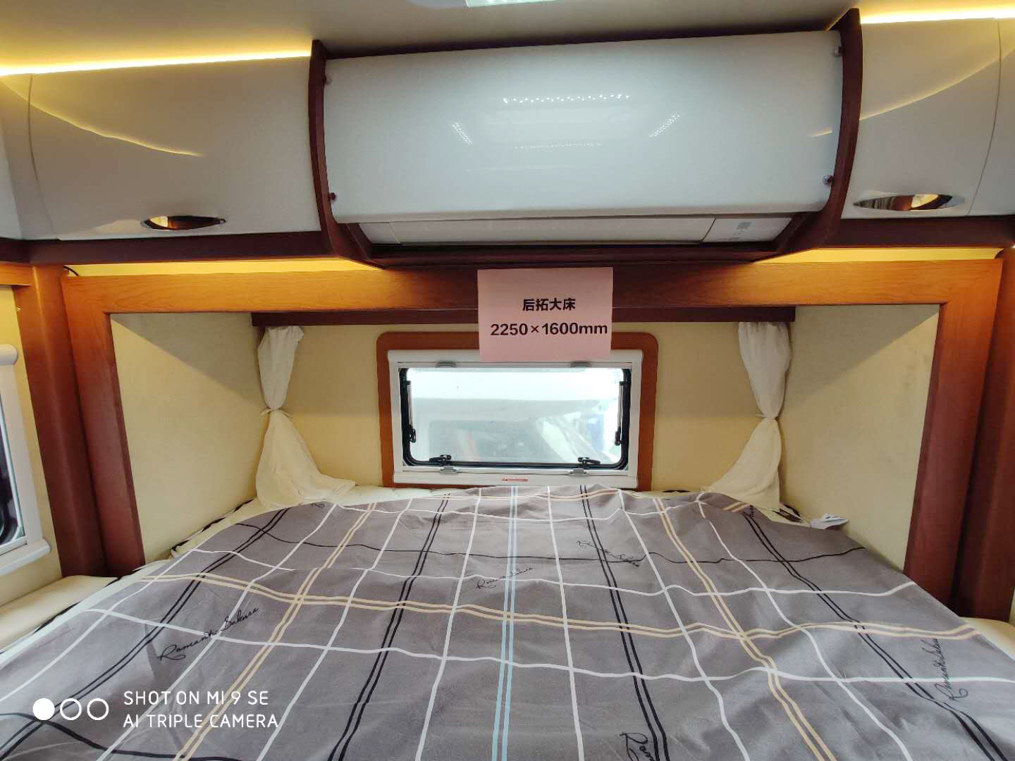 車廂尾部是后置雙人床區(qū)域,尺寸為2300×1450mm,三面帶外推窗,后拓展倉打開后,床鋪足夠?qū)挸ā4采戏绞莾ξ锕窈?.5P 家用可變頻空調(diào)。