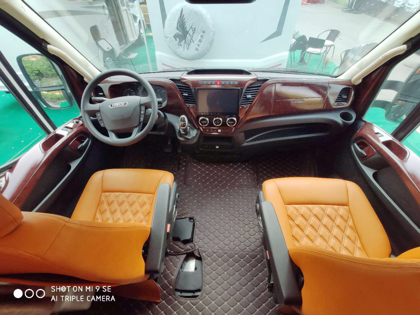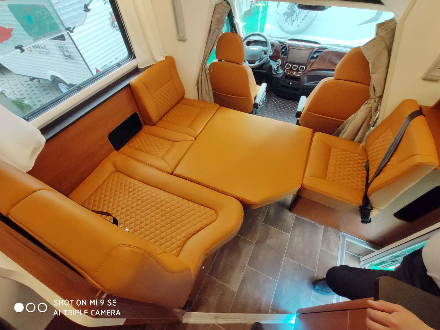 內(nèi)飾布局方面,從前到后依次是駕駛室、會客區(qū)、升降床、廚房、衛(wèi)生間、后置雙人床。駕駛室儀表臺及兩側(cè)車門進行了個性化改裝,中控區(qū)加裝了多媒體導航顯示屏,兩個空氣懸掛座椅采用皮革包覆,與后方車廂內(nèi)飾顏色保持一致,兩個座椅還可以向后旋轉(zhuǎn)。駕駛室上方是32寸液晶電視,車廂連接處配有布藝窗簾,可以保護隱私。