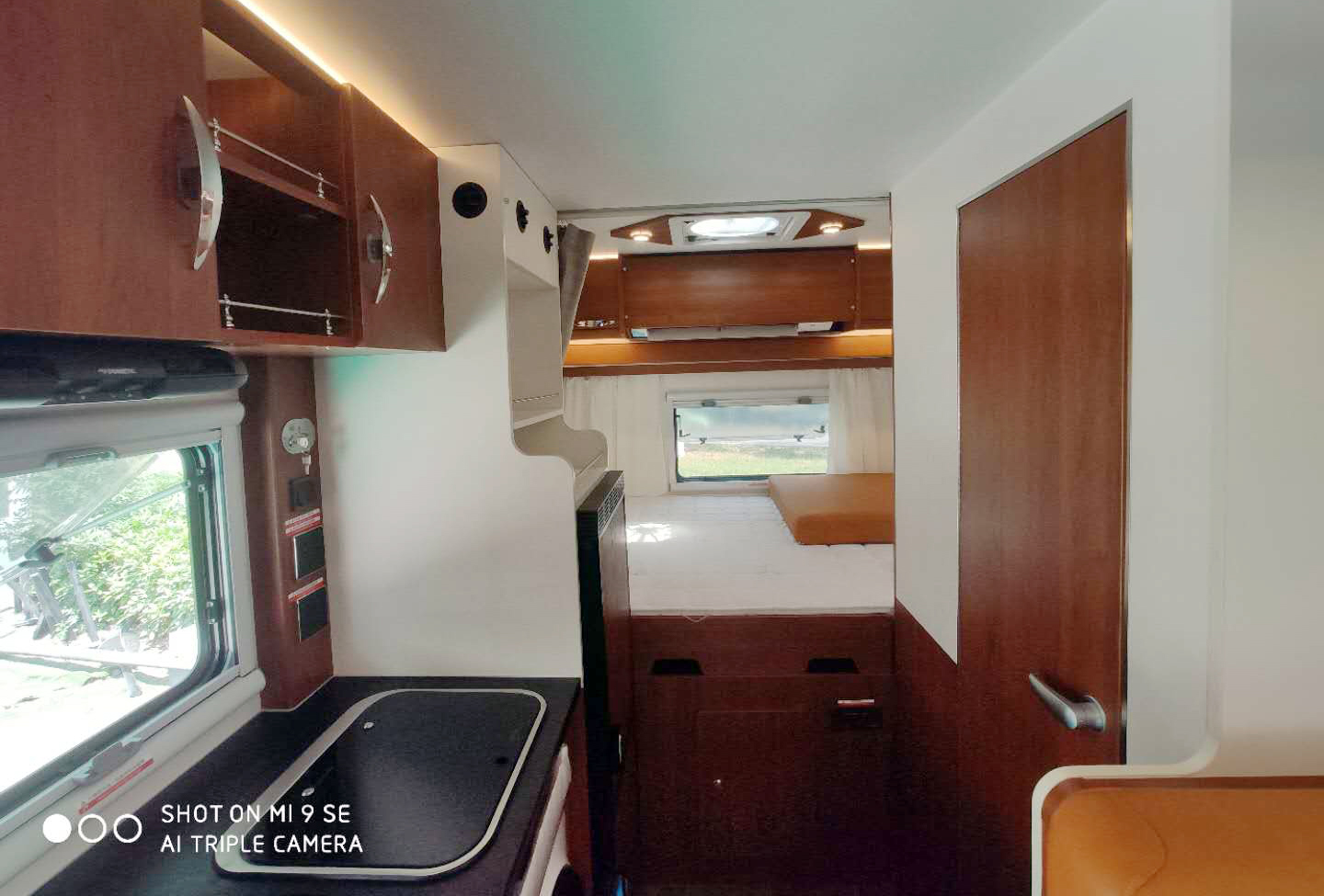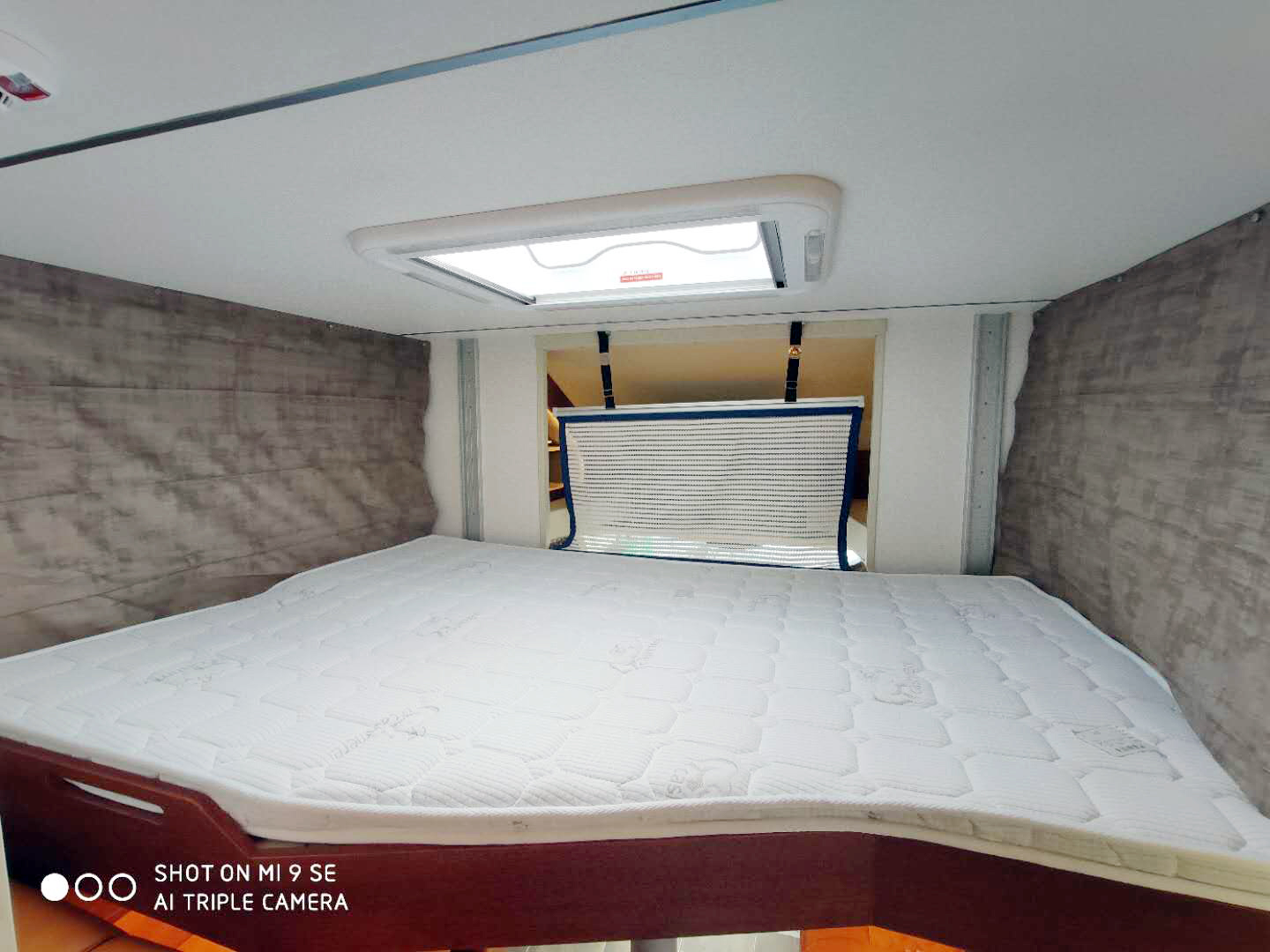 駕駛室上方是2250×1200mm的雙人額頭床,可通過爬梯上下,雙人床向上翻折后是32寸液晶電視。