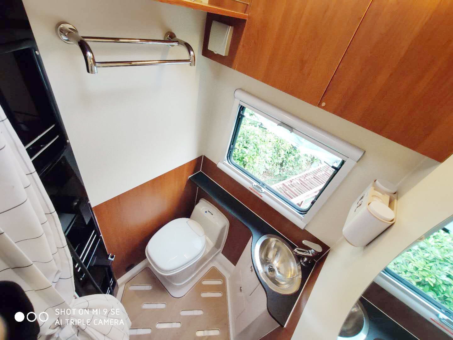 衛(wèi)生間做了干濕分離處理,換氣扇、儲物柜、毛巾架、防水浴簾、化妝鏡、淋浴花灑、洗手池、房車專用馬桶等配置齊全。