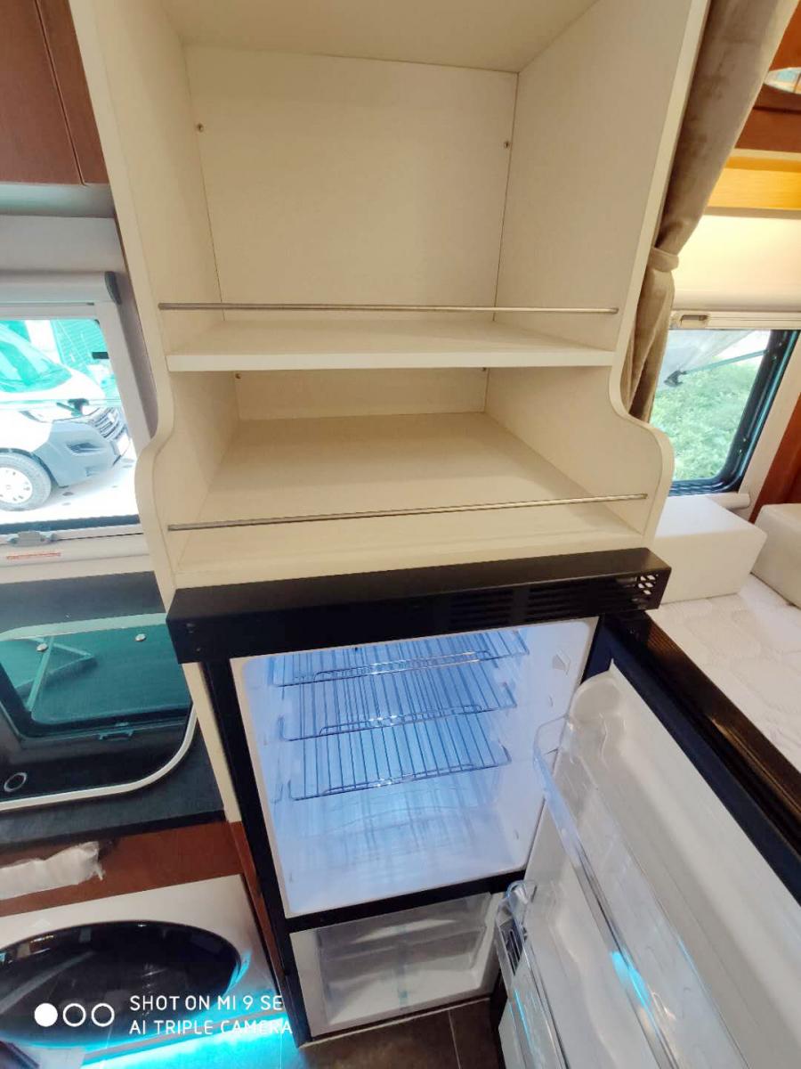 車廂后部是廚房、衛(wèi)生間、后置雙人床區(qū)域,廚房設(shè)計在車門邊上,配備了儲物柜、儲物柜、抽油煙機、電磁爐、帶蓋洗菜池等生活設(shè)施,3公斤洗衣機設(shè)計在櫥柜下方。櫥柜邊上是儲物格和弗羅斯特148L車載冰箱。