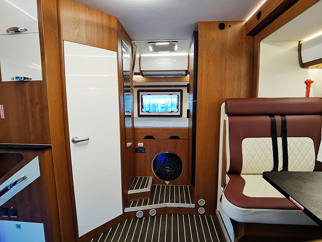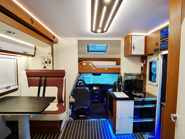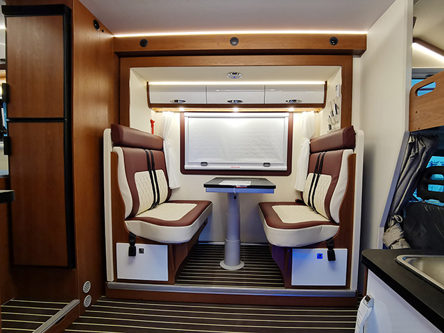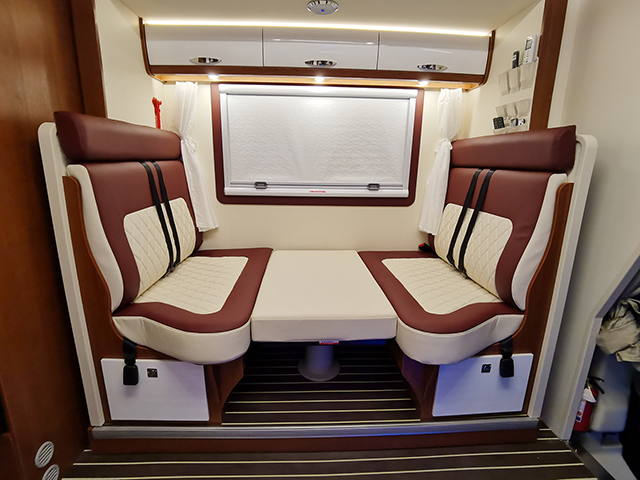 內飾布局從前到后依次是駕駛室、雙人額頭床、雙人對坐沙發卡座、廚房、衛生間、尾部橫置雙人床。