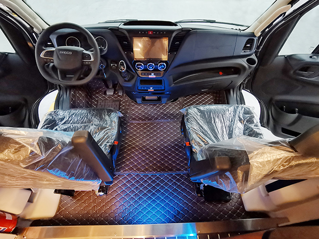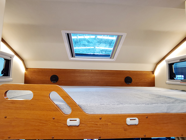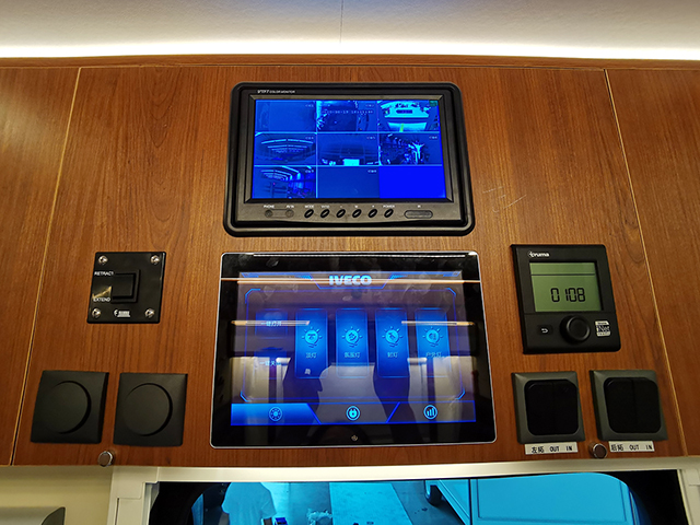 駕駛室內部改動不大,僅在中控區加裝了大屏GPS導航一體機,帶倒車雷達和攝像功能,主副駕駛減震座椅沿用原底盤裝飾,副駕駛座椅可旋轉。上方的雙人額頭床可通過爬梯上下,還配有外推窗和大尺寸天窗,保證通風和采光,32寸液晶電視依然在床底部。