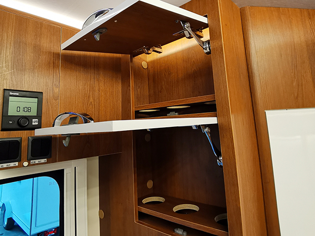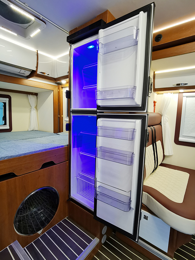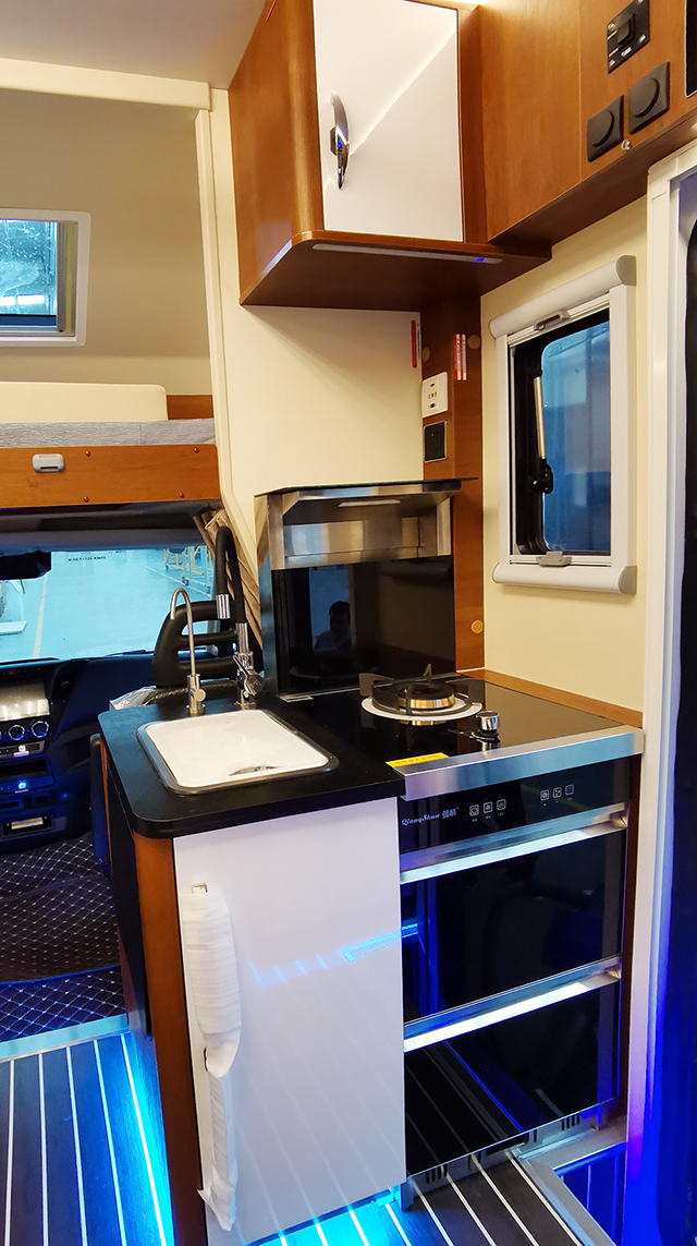 廚房區整體櫥柜設計在副駕駛后邊,采用了集成灶,集吸油煙機、燃氣灶、消毒柜、儲藏柜等多種功能于一身,還配備了凈水系統、房車專用洗菜池、五孔插座等,洗菜池邊上設計了折疊式置物板,塞特福德152L車載冰箱位于卡座沙發后邊,獨立的冷凍、冷藏區域。