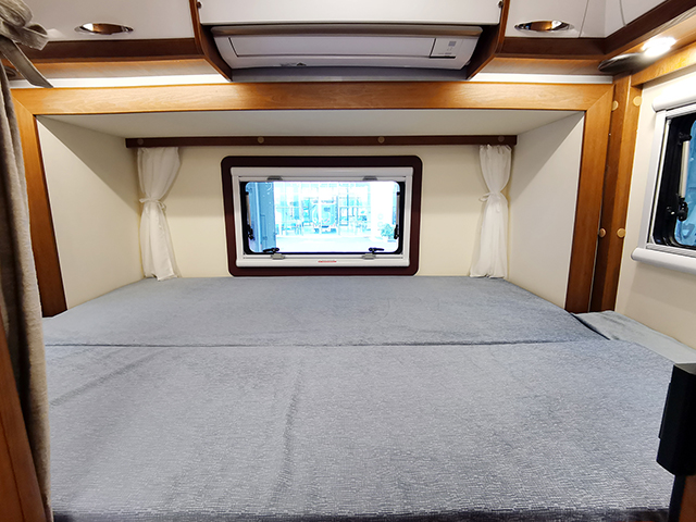車輛后拓展打開后是一個寬敞的橫置雙人床,三面帶外推窗,床的上方是頂置儲物柜,中間安裝了大金1.5P家用變頻冷暖空調,洗衣機設計在雙人床下方。