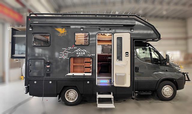 新車在外觀方面與霍夫勒黑金剛系列車型保持風格一致,三明治式復合車身結構,全鋁車身+全鋁裙邊,搭配高強度航空鋁板外墻板,保證車體的穩固性和防腐性。車身外側配備了遮陽棚、儲物艙、水電接口、戶外噴頭、戶外廚房、戶外折疊板、5公斤燃氣罐艙、電動踏步、前雷達防撞系統、后拖車鉤等。
