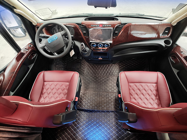 駕駛室在原進口依維柯底盤的基礎上進行了個性化改裝,中控區加裝了GPS導航一體機。主副駕駛減震座椅采用皮革包覆,整體感覺高端大氣。動力方面,搭載3.0T柴油發動機,最大功率為170馬力,峰值扭矩400牛米,8AT變速箱。