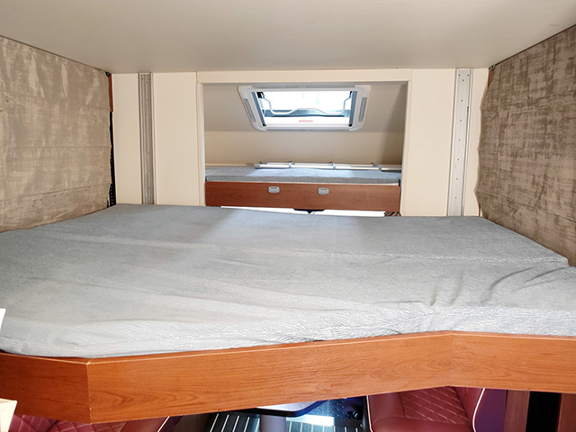 駕駛室上方是額頭床,可通過爬梯上下,頂部帶大尺寸天窗,保證車內通風和采光。額頭床可以向上翻折,32寸液晶電視和音響設計在床底部。