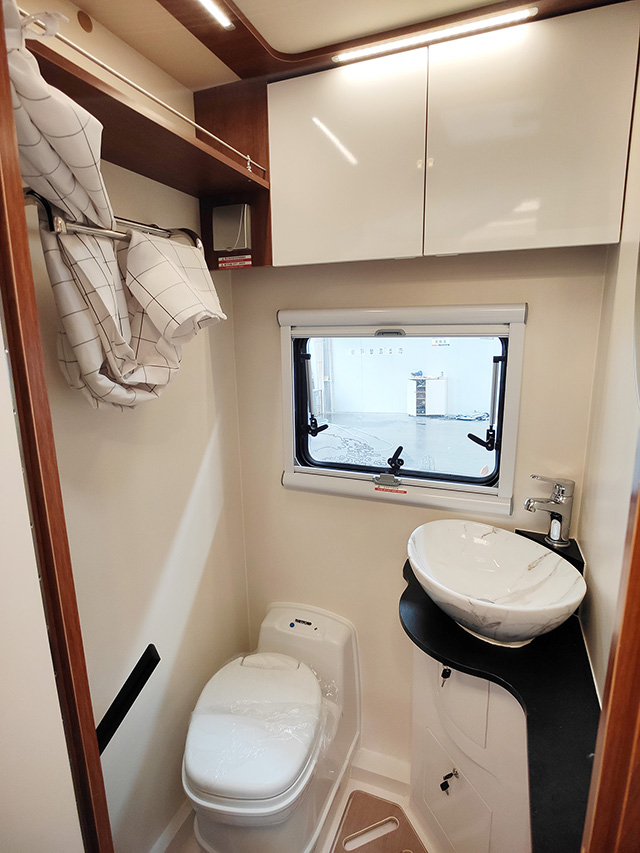 獨立衛生間位于廚房對面、會客區后邊,地板做了干濕分離,排風扇、儲物柜、洗手臺盆、淋浴花灑、防水浴簾、房車專用坐便器、化妝鏡等配置齊全。