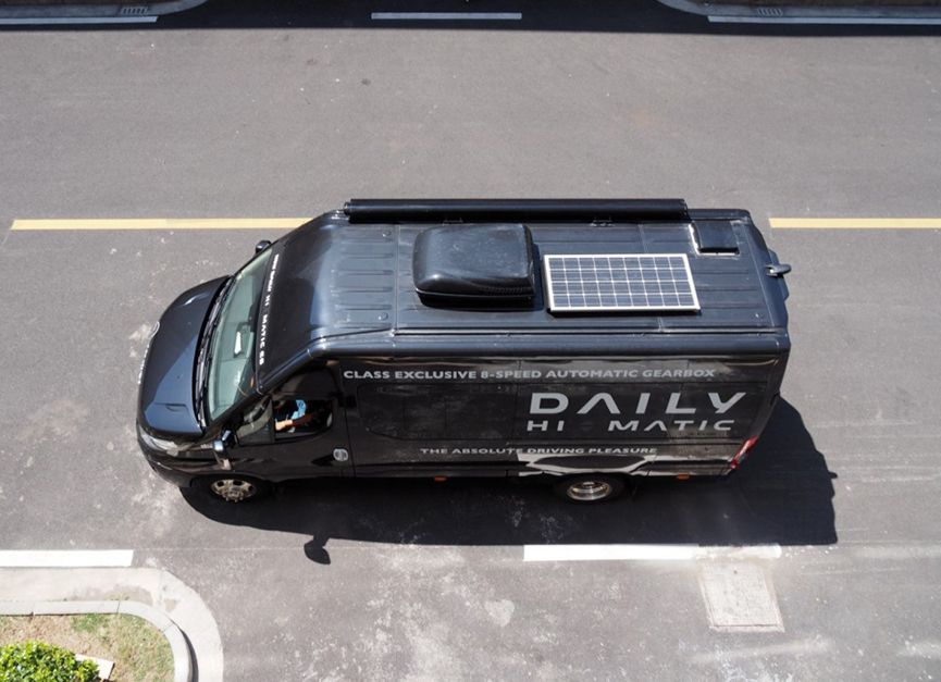 車身深邃的黑色金屬車漆在陽光的照耀下從不同角度反射出熠熠奪目的光亮,十分耀眼,整車的質感非常好。同時車頂也配備了太陽能電池板。