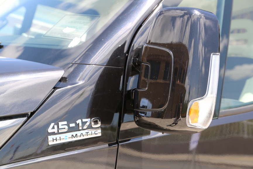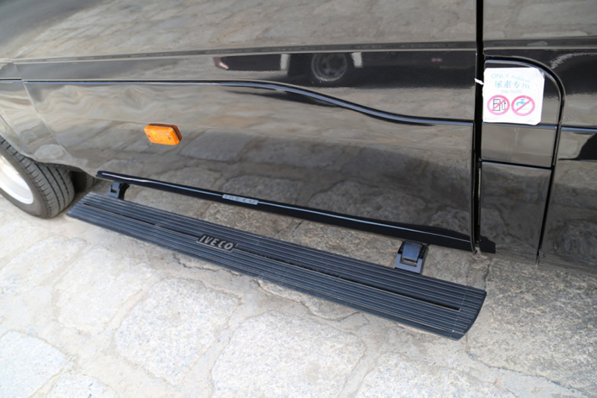 從外觀來看車身側面配備進口菲亞瑪手動遮陽棚,車身右側側滑電動乘客門,車門下方還配備了帶logo的電動迎賓踏板方便乘客上車。
