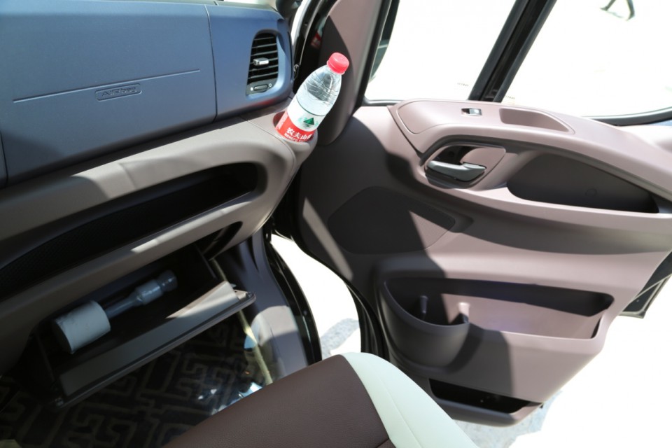 在諸如副駕駛手套箱上方以及車門內側還采用了真皮材質包裹,用料相當講究,同時在此處還設有儲物空間,方便駕駛室乘客存放物品。