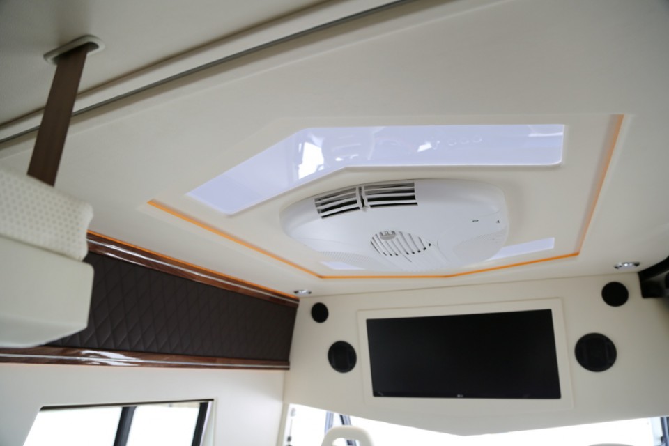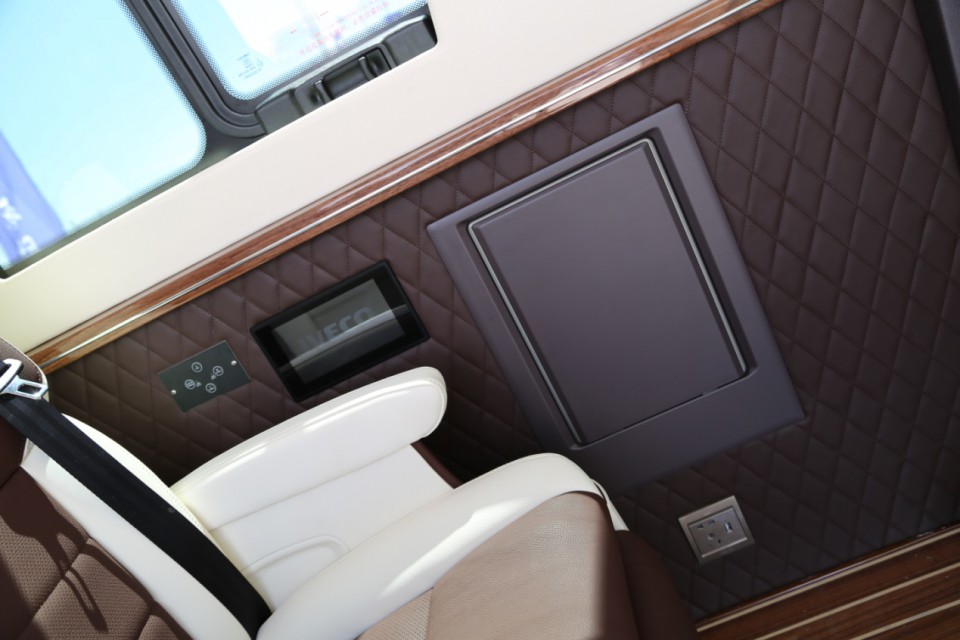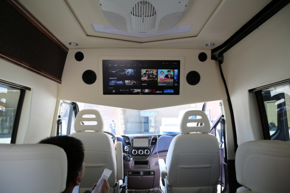 與商務座椅相互輝映的是車輛的娛樂系統,駕駛室上方配備液晶電視并配套智能電視盒子,定制房車專用豪華音響,還可通過USB接口讀取媒體文件播放并支持上網,車載電視的背景板也采用了進口超纖皮包裹。