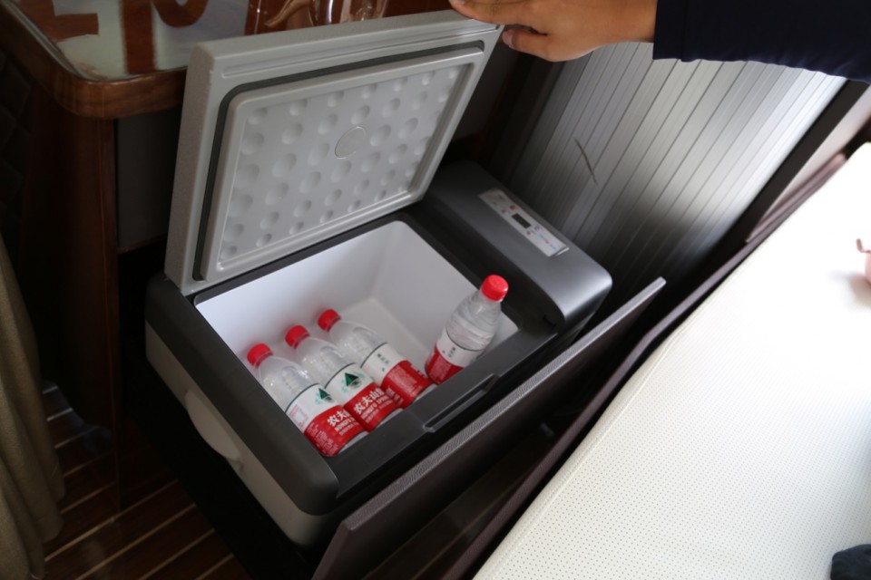 車廂中部為廚房區,操作臺面非常平整,由于車款車側重于商務范兒,所以配備了燒水壺及下部抽拉式12L壓縮機冰箱。