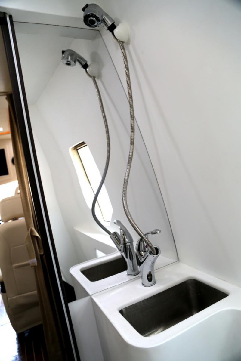 在車身的尾部配備有整體式衛生間,衛生間內部空間相對較為緊湊,但勝在配置齊全,配備了固定式洗手池,進口電動游艇坐便器、玻璃鏡面 、防滑鵝卵石地板、衣架、掛鉤、卷紙架等。