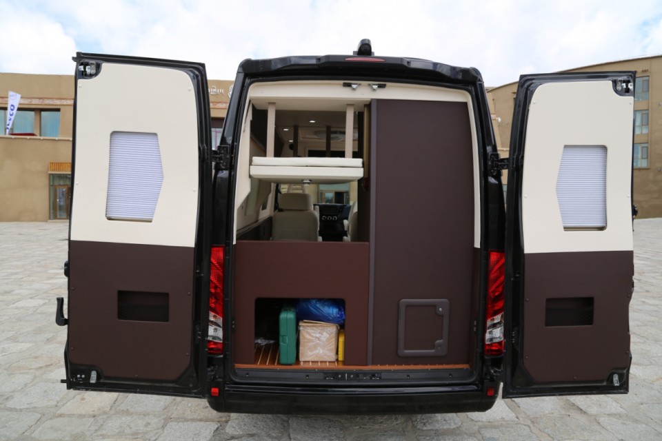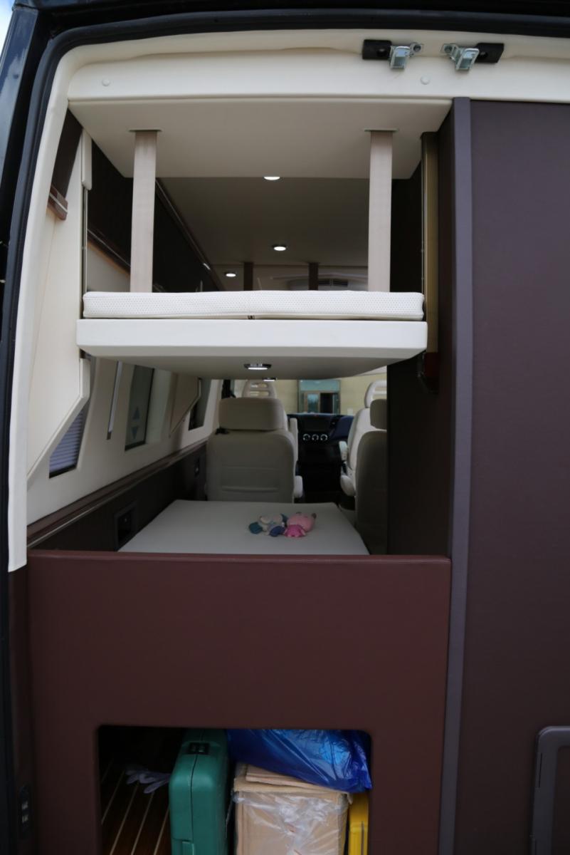 從整體上看車廂內部空間設計非常清晰,內飾設計其中一大亮點是采用電動升降床布局,實現了空間的最大化利用,車廂中部為2個航空座椅,向后依次為廚房區、上下床及整體式衛生間,空間布局合理,空間利用率較高。