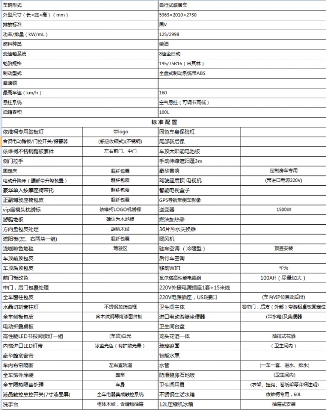 該車配備有車道偏離預警系統、后輪空氣懸掛系統、后輪差速鎖、四方位安全氣囊及匹配與瑪莎拉蒂同款的Hi-Matic 8速全自動變速箱;動力方面采用了F1C3.0T渦輪增壓柴油發動機,最大功率為125KW/170馬力,峰值扭矩400牛米,滿足國五(歐六)排放標準,最高車速可達160km/h, 100L大油箱。