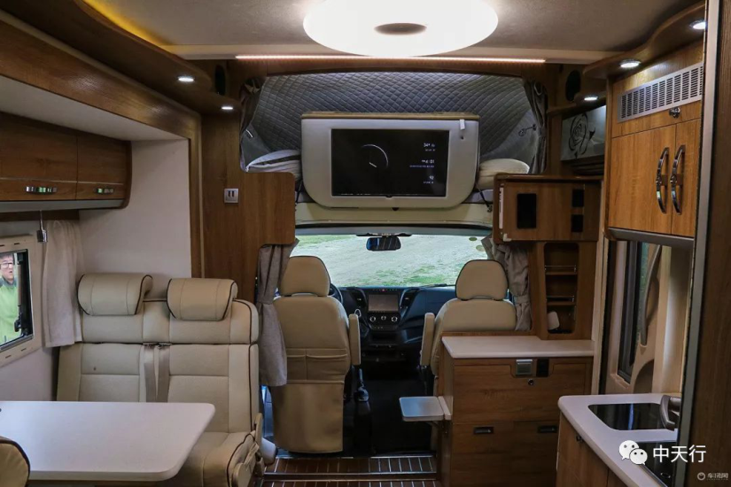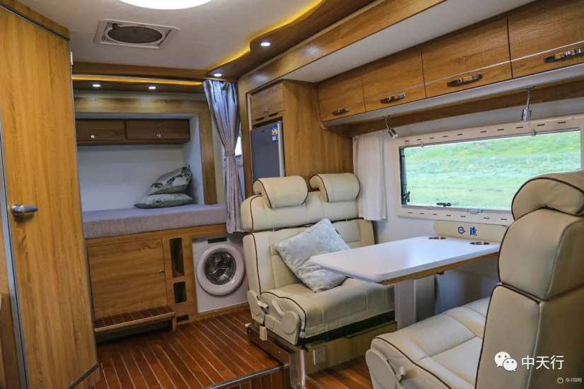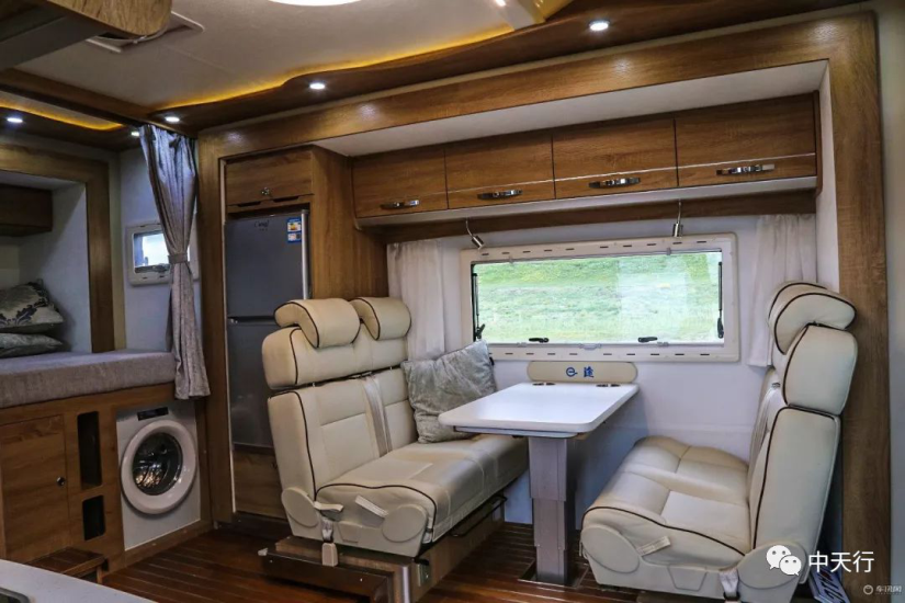 車廂部分采用了大量的木質(zhì)裝飾,搭配乳白色真皮座椅、亞麻床墊和仿大理石臺面,透著濃郁的“宜家北歐”風格,坐在其中給人感覺十分溫馨。