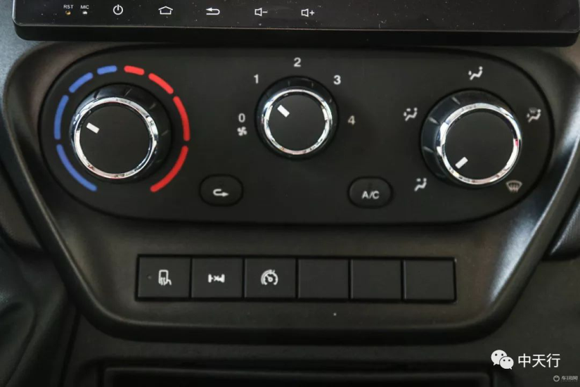 屏幕上方為燈光和電子穩(wěn)定程序控制開關(guān),下方為空調(diào)控制區(qū)域,與屏幕一樣,該車還可選裝自動空調(diào),此外,該車還配備了定速巡航、后橋機械式差速鎖和360度全景影像。