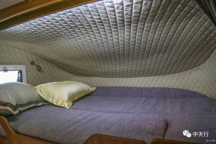 駕駛室上方為一個2180毫米*1500毫米的雙人床,床鋪的軟包環(huán)境看著就很舒適,在床兩側(cè)均配窗戶,空間通透不壓抑。將床板向上翻折,下方為一臺32英寸的小米電視,該電視配有衛(wèi)星天線,用戶可通過手機軟件投屏觀看節(jié)目。車尾放置了一張2180毫米*1200毫米的床鋪,與車頭相同,床鋪兩側(cè)同樣配有窗戶,床鋪下方的空間合理利用,安置了洗衣機和儲物柜。