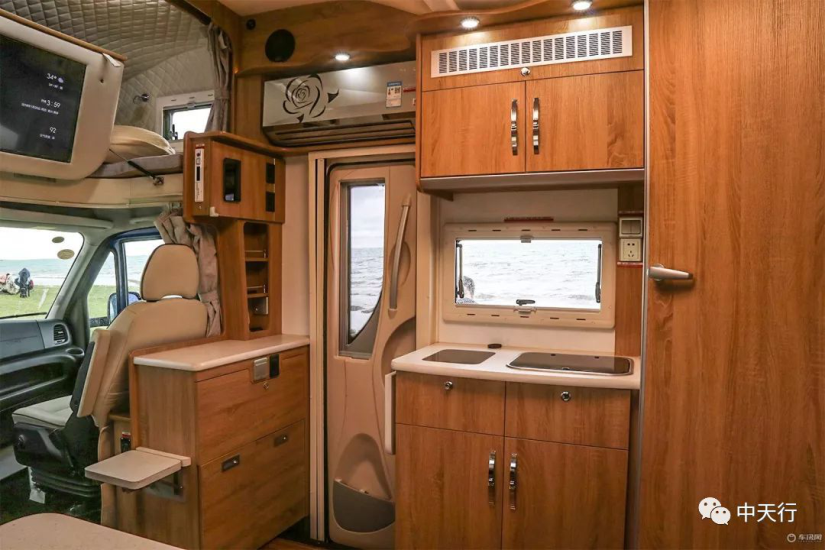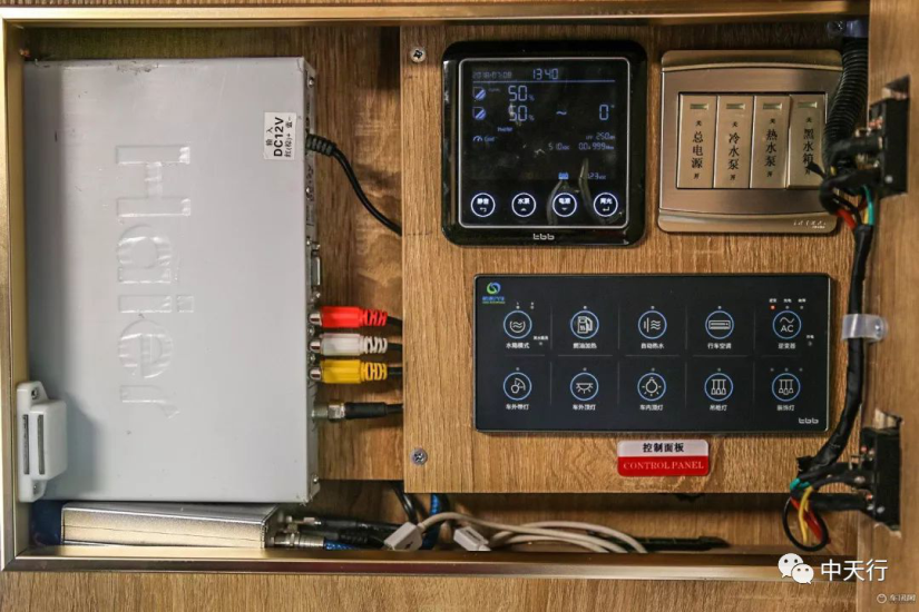 車廂的總控制系統(tǒng)被安置在了副駕駛后方,乘員可以通過該套系統(tǒng)控制車內(nèi)的水電路、空調(diào)、燈光、充電等功能。車內(nèi)還配備了一塊平板電腦,裝置了國內(nèi)第一套自主知識產(chǎn)權(quán)的水電路控制系統(tǒng),用戶可以通過電腦控制,此外,車輛當前水位、電位,也可通過車體監(jiān)控顯示屏和手機APP端雙向查詢、控制,做到遠程操作。