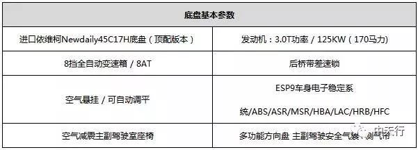 進口依維柯Daily底盤,采用了前雙叉臂橫置獨立懸架,后橋空氣懸架系統(tǒng),此外,該車后橋還配備了一把機械式差速鎖。