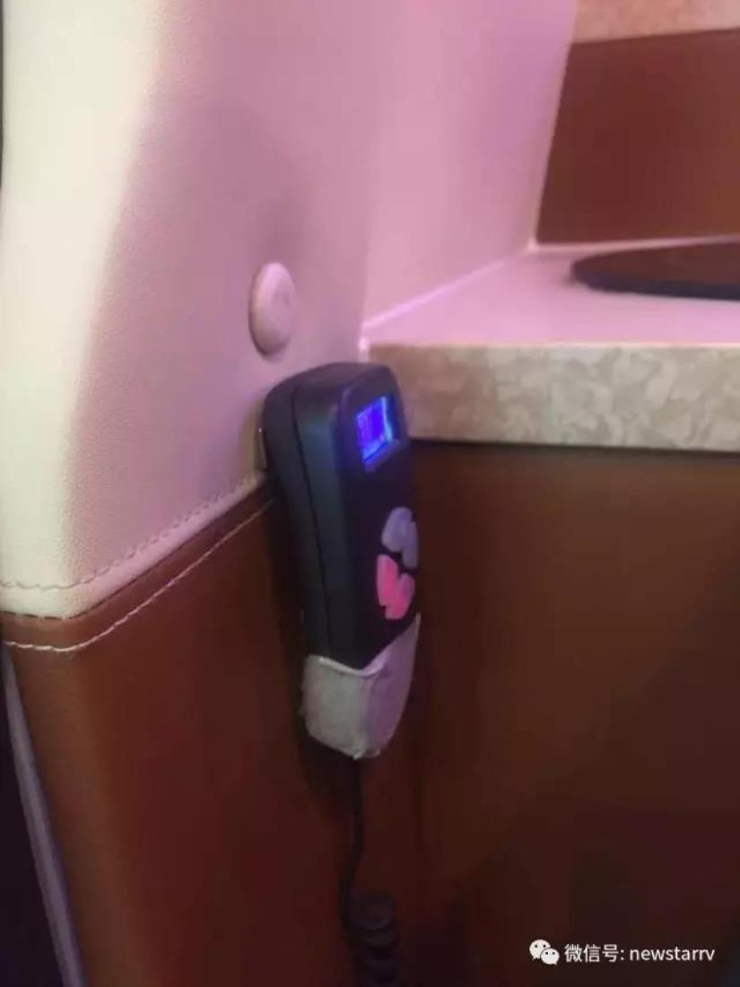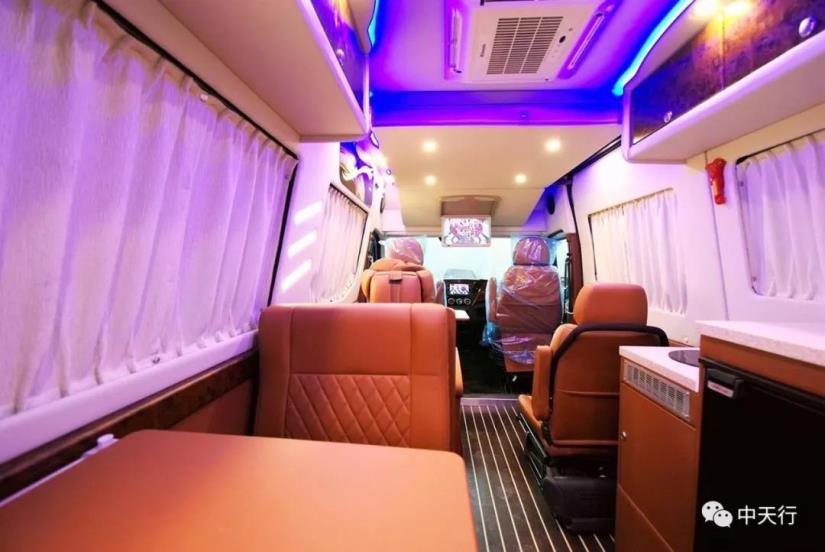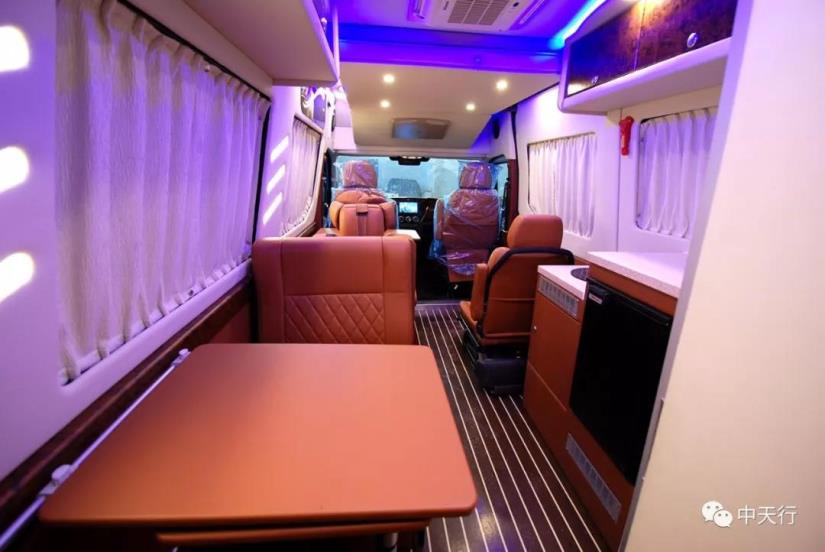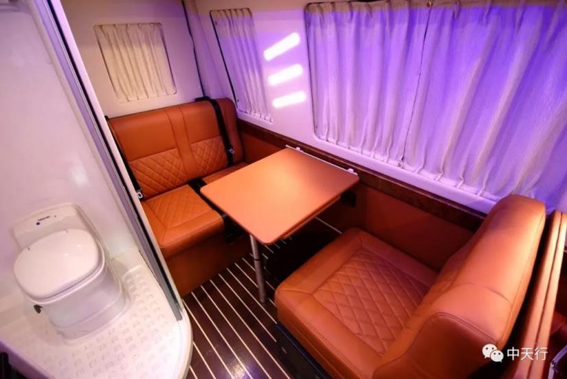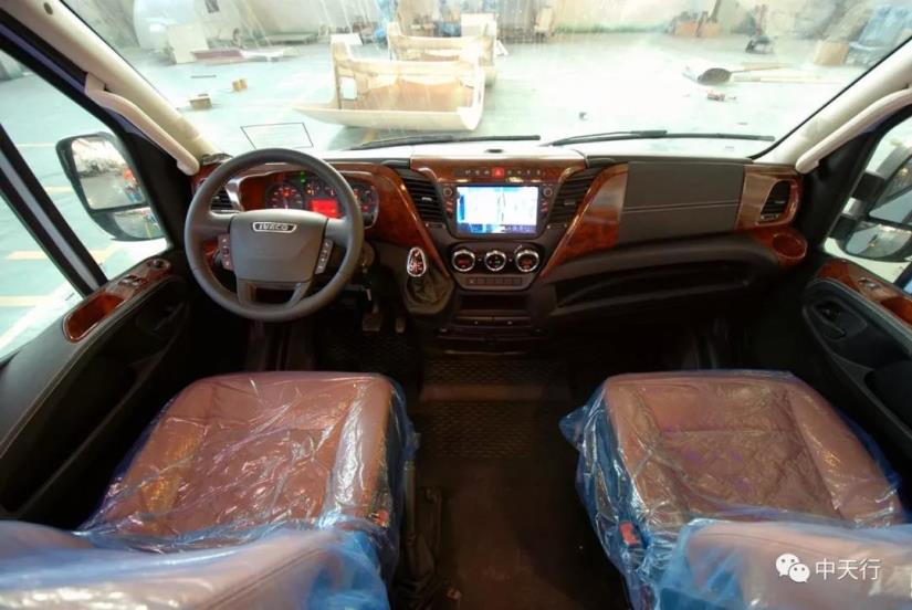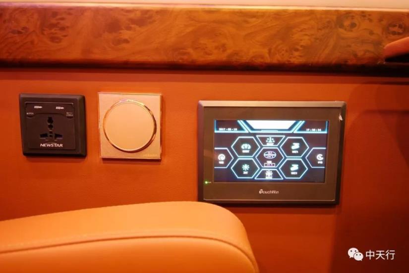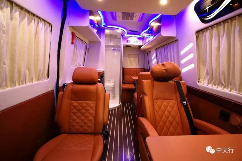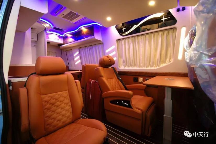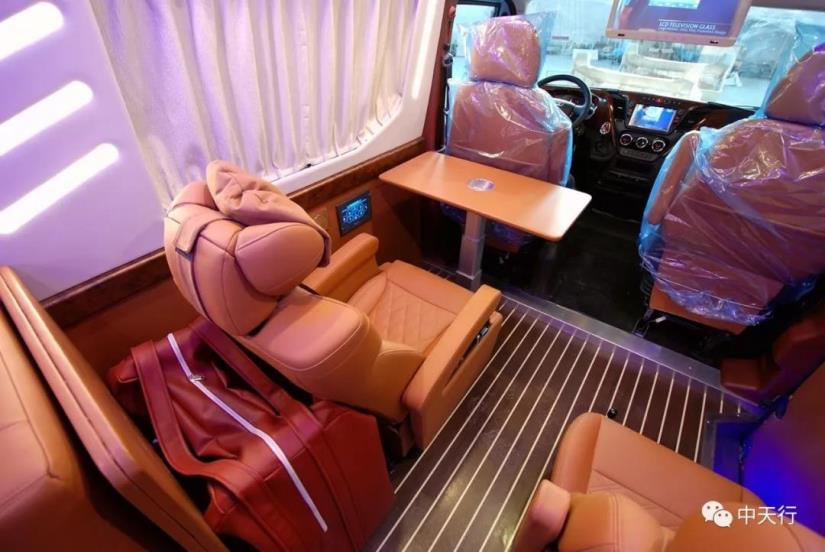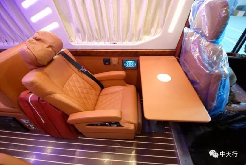車廂中部為兩個航空座椅,可調節,帶加熱和按摩功能。左側座椅邊上配有五孔插座和觸屏面板。駕駛室正副司機座椅旋轉后可形成一個四人的會客區,中部升降桌可升降,方便實用。
