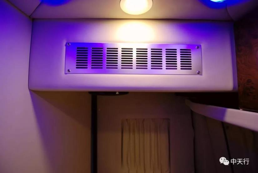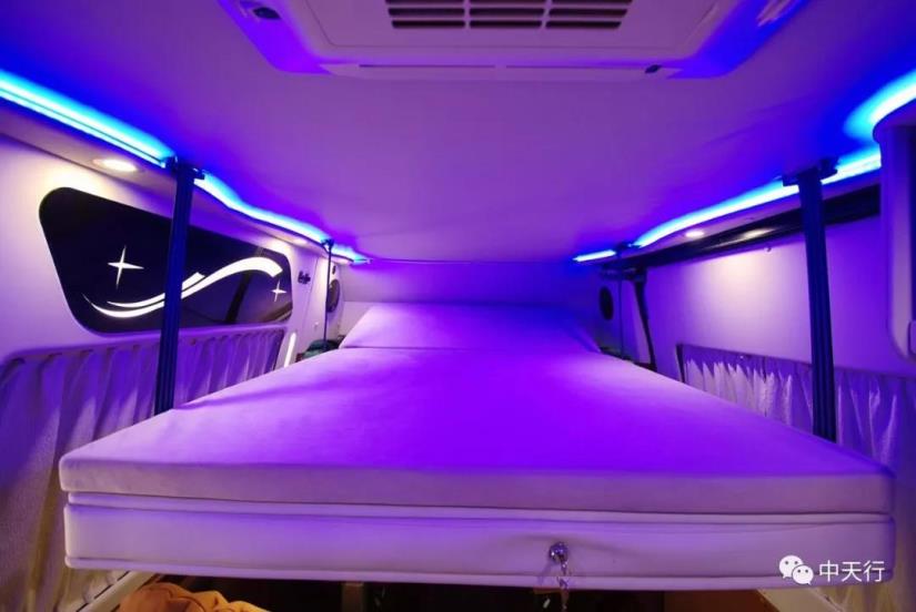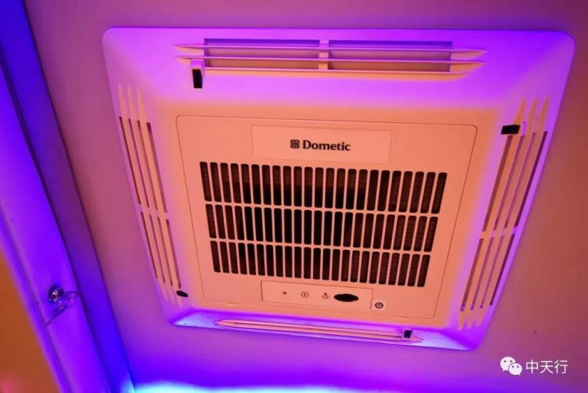 會客區上方為電動升降吊床,高度適宜。車頂設置了多美達空調。