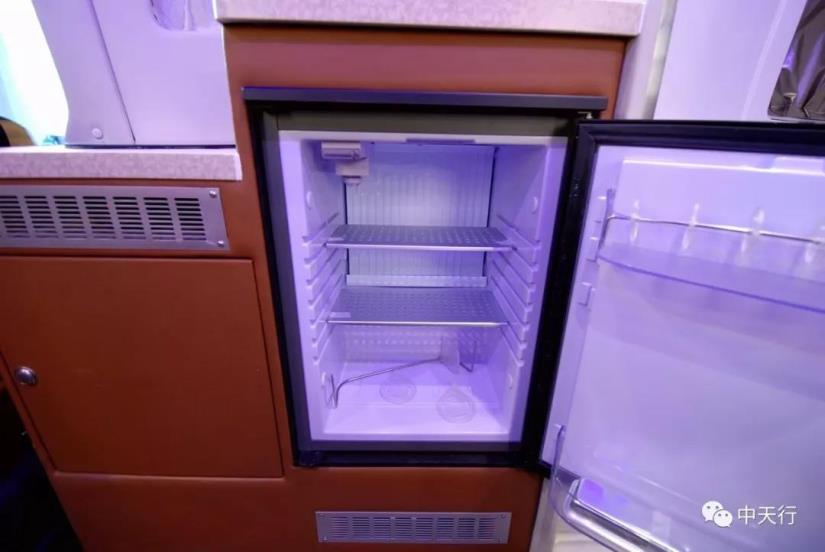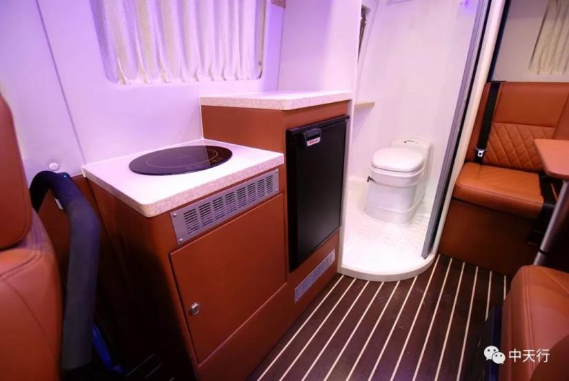 車廂后方定制的也與以往B型房車不同,右側為廚房區域,電磁爐、帶蓋洗菜池、35L車載冰箱、儲物柜等常規配置一應俱全。