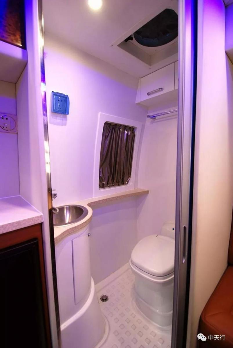 緊挨廚房的是衛生間,洗手盆、一體式淋浴花灑、房車專用坐便器、毛巾架等配置較為常規,搭配120L清水箱,50L污水箱。