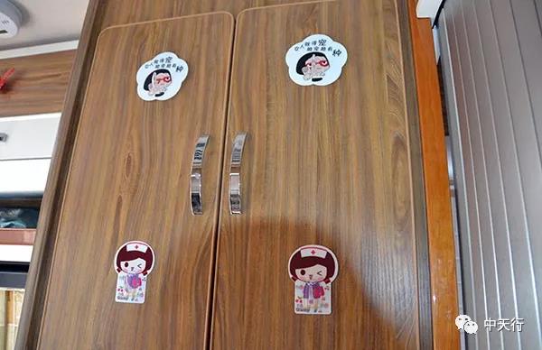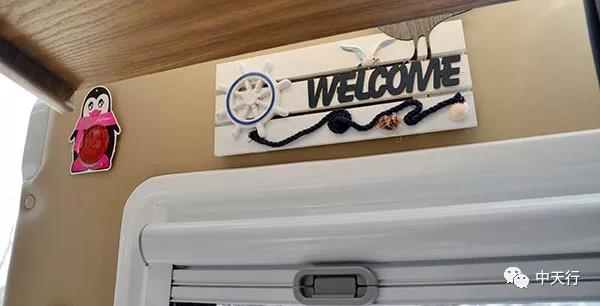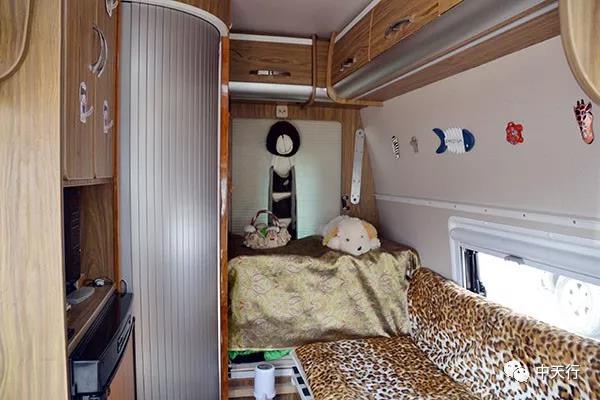 “女人就得寵,越寵越有種”,在車友譚旭東和夏阿姨的進(jìn)口依維柯B型房車上,貼著很多卡通小貼畫,而這句話正對(duì)著床鋪,抬頭便可以看到,很有情調(diào)。