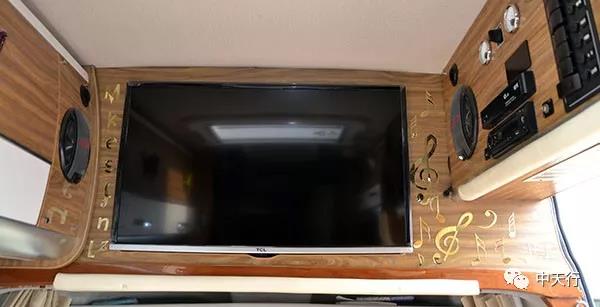 房車內(nèi)飾部分是按照譚先生夫婦的意愿改裝的,很有特色。駕駛室保留了進(jìn)口依維柯原裝風(fēng)格,駕駛室上方為液晶電視,駕駛室與后方車廂為前后貫通式結(jié)構(gòu),打開(kāi)車門便是會(huì)客區(qū),兩個(gè)面向門的沙發(fā)很舒適,沙發(fā)中部為升降桌。