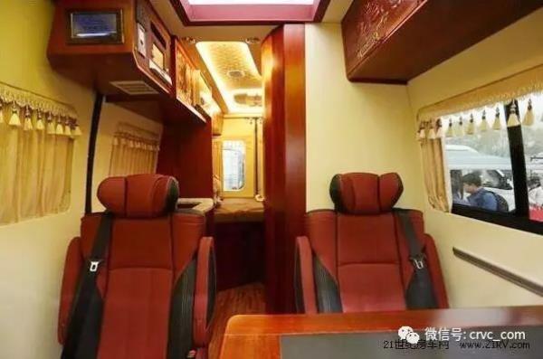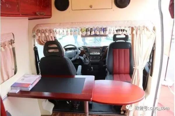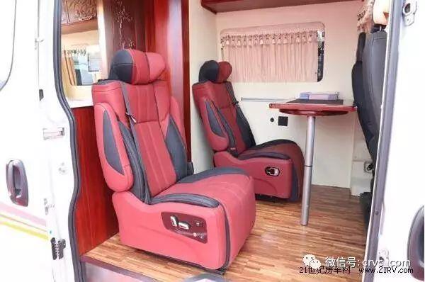 駕駛室與車廂后方為常見的前后貫通式結(jié)構(gòu),中部乘客區(qū)配置兩個(gè)豪華航空座椅,帶電動(dòng)按摩電加熱功能。餐桌可以前后平移,旋轉(zhuǎn)擴(kuò)張。