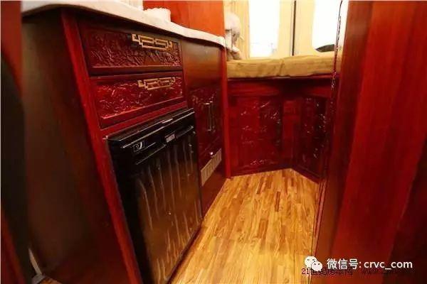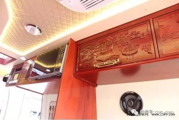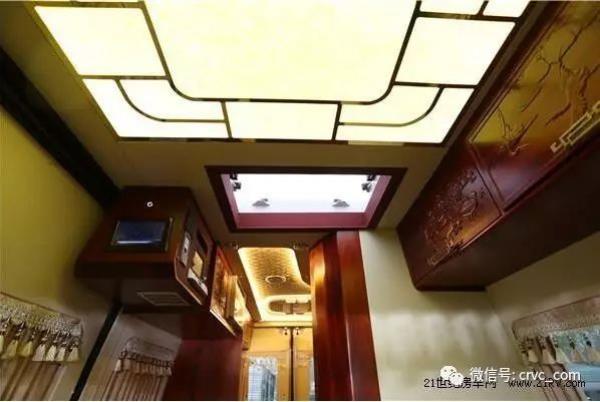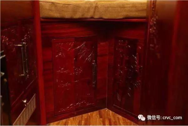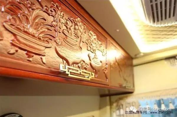 采用實(shí)木地板裝飾,全車實(shí)木吊柜,木材選用上等紅花梨,所有木門都雕花處理,采用中式雕花風(fēng)格,中國(guó)風(fēng)元素隨處可見。