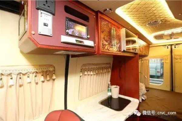 車廂中部為廚房區(qū)域,操作臺(tái)上配備一個(gè)帶玻璃蓋板的洗菜池,做飯的話可以外接電磁爐。廚房上方為車內(nèi)的多功能區(qū),集成了五孔插座、觸控面板、儲(chǔ)物柜、微波爐、DVD一體機(jī)、3000W逆變器、衛(wèi)星天線接收器等。