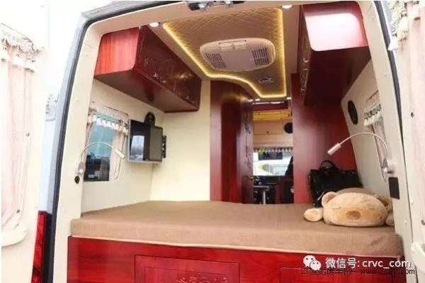 車尾部是一張大床,尺寸為:1800×1300mm,床的上方設(shè)有實(shí)木置物吊柜,方便放置日常生活用品,雙人床下方則是超大存儲(chǔ)空間。