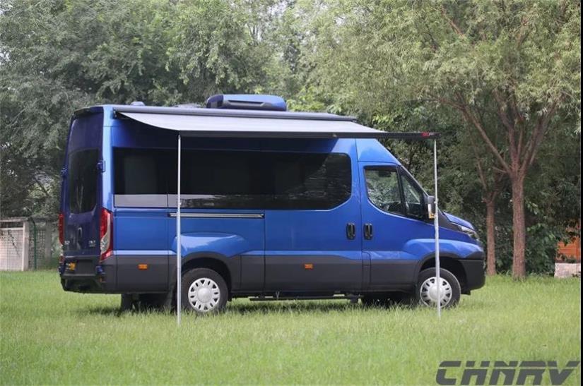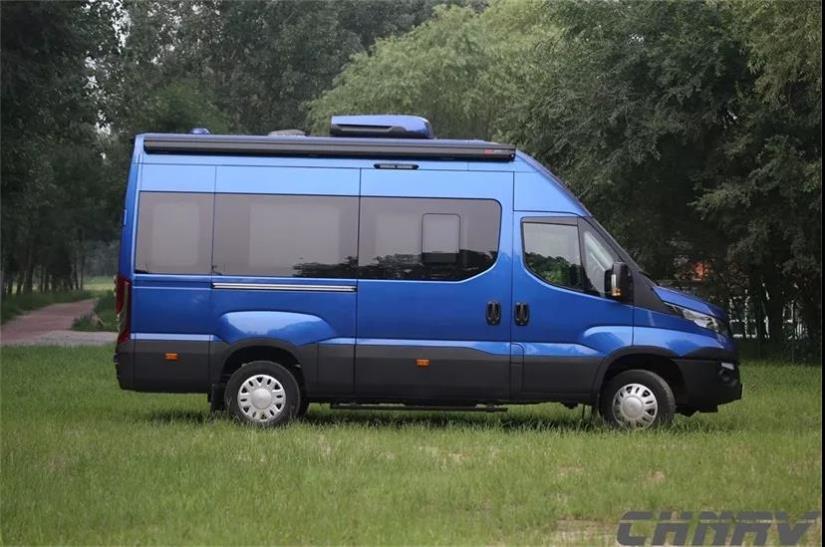 車身右側采用側滑門作為乘客門,車門下方還配備了電動迎賓踏板方便乘客上車,在車身側面還配備了進口菲亞瑪F45s手動遮陽棚。新車的整車尺寸為5995× 2010 ×3150(mm),軸距為3520mm。