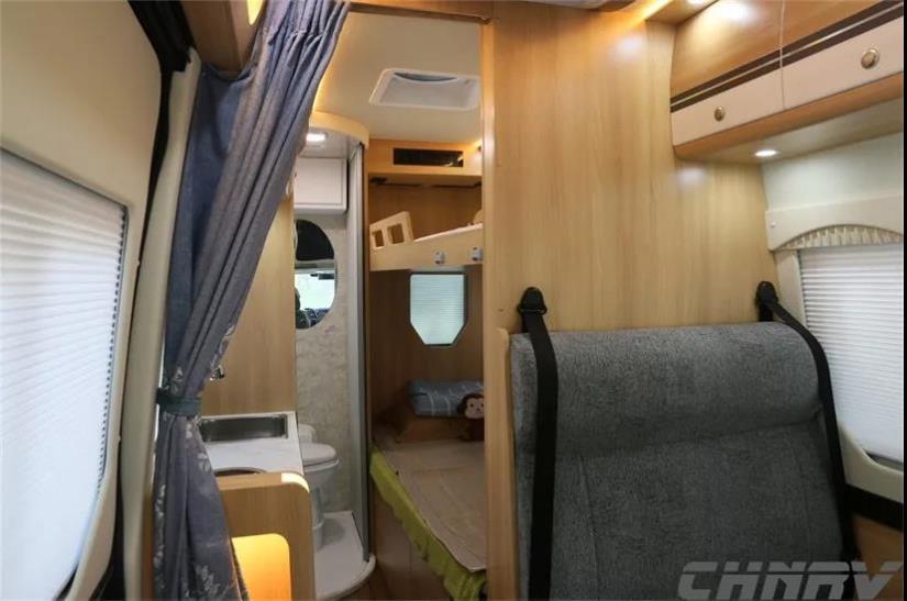 車廂部分沒有采用B型房車常用的升降床布局,而是通過上下床實現睡臥空間的最大化,車內會客區、廚房區及衛生間一應俱全。車內采用德國原裝進口菲林格爾家具生產,地板采用柚木鋪設,雙人沙發座椅采用美國原裝進口魔術絨包覆。