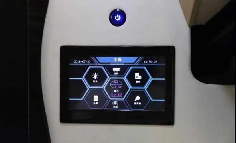 總控面板采用觸控屏的形式,包括控制及電瓶水箱狀態查看全部集成于觸控屏內,通過觸控屏可控制車內燈光、空調、音響、冰箱、水泵及逆變器,中央區域則用來顯示電瓶電壓及凈/灰水箱水位,新車標配了3000W充逆變電一體機及400Ah鋰電池,較高的功率能夠滿足大部分用電需求,同時電瓶容量也高于平均水平。