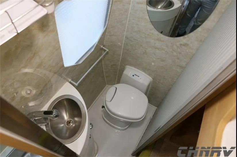 在車身的尾部布置有整體式衛生間,衛生間內部配置齊全,配備了固定式洗手池、進口賽特福德房車專用盒式座便器、淋浴花灑、換氣扇、儲物柜等。為了提高空間利用率,衛生間采用了軌道式側滑門,完全不占用外部空間。