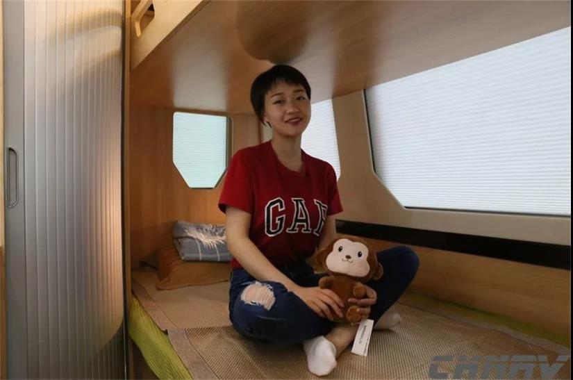 車尾的睡臥區,采用了上下床的布局提高了空間利用率。經測量,床位尺寸為1980×920(mm),容納兩名成年人休息非常合適。上下鋪的垂直空間分配較為合適,下鋪頭部空間充足,身高166cm的體驗者可在下鋪坐起。