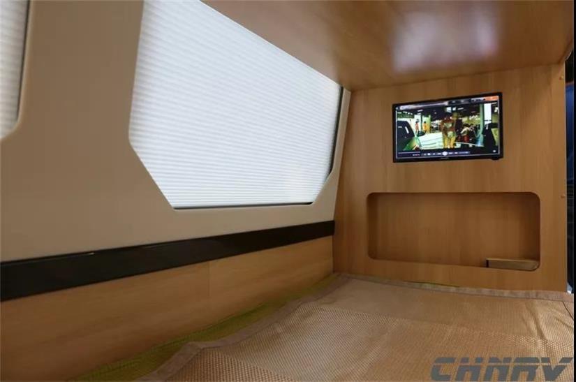 駕駛室上方配備32寸液晶電視并配套小米盒子,還可通過USB接口讀取媒體文件播放并支持上網,還可通過鼠標控制,功能性上相當于一臺電腦。在電視兩側還添加了機械式儀表,分別為車內溫濕度計及石英表,除了提高檔次感,通過溫濕度表也能了解車內空氣狀態是否適宜,具有一定的實用性。另外,車載電視的背景板也采用了進口超纖皮包裹。