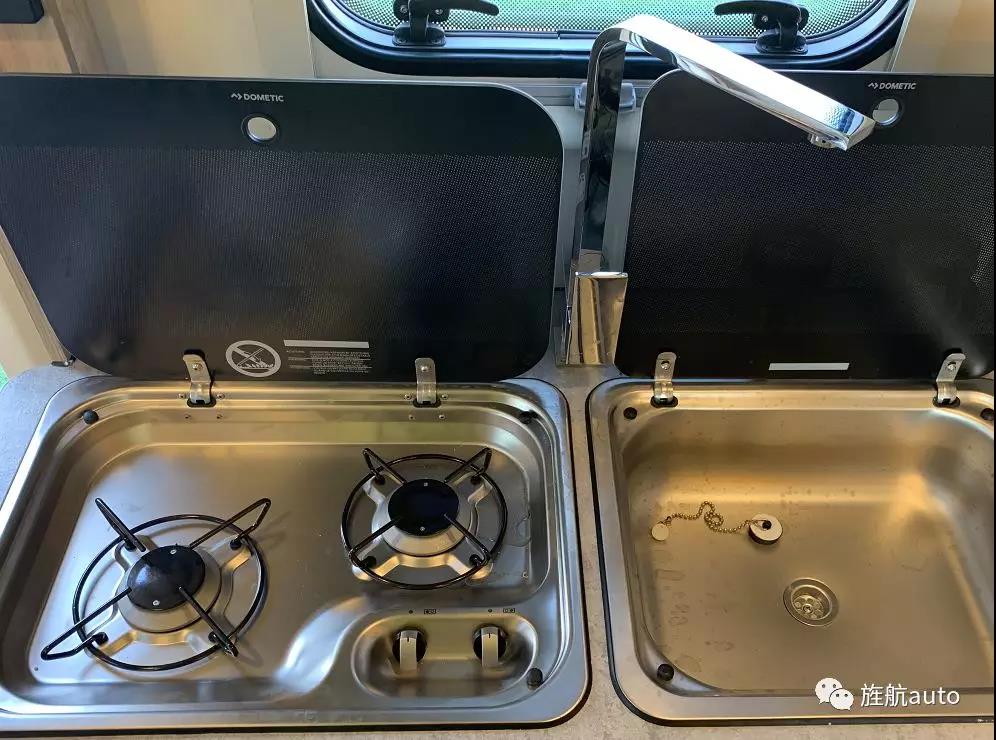 車廂中的廚具系統包含多美達燃氣灶、側排式油煙機、微波爐、櫥柜、多美達翻蓋式水槽,讓生活更精彩。